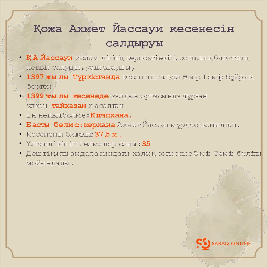 • 1397 ж ы лы Түркістанда кесененісалуға Ә мір Темір бұйры қ