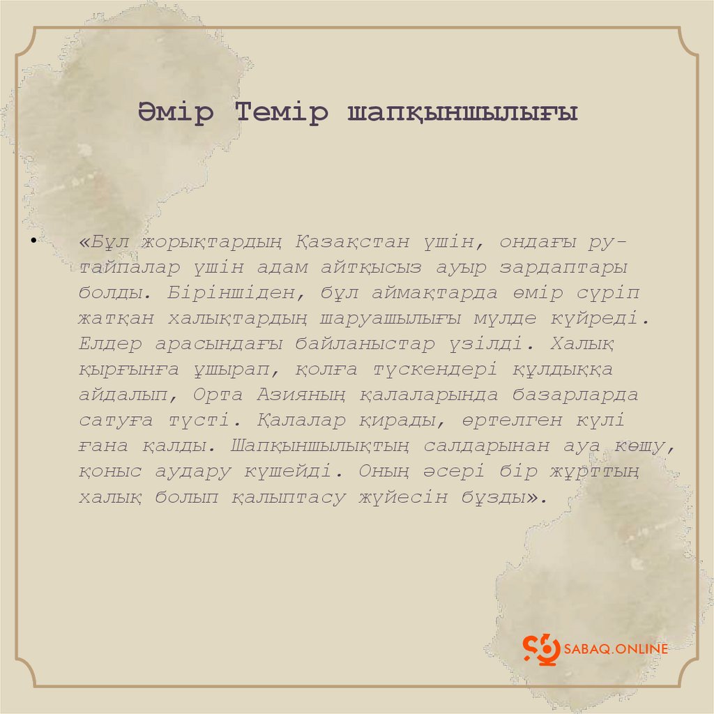 Әмір Темір шапқыншылығы«Бұл жорықтардың Қазақстан үшін, ондағы рутайпалар үшін адам айтқысыз ауыр зардаптары