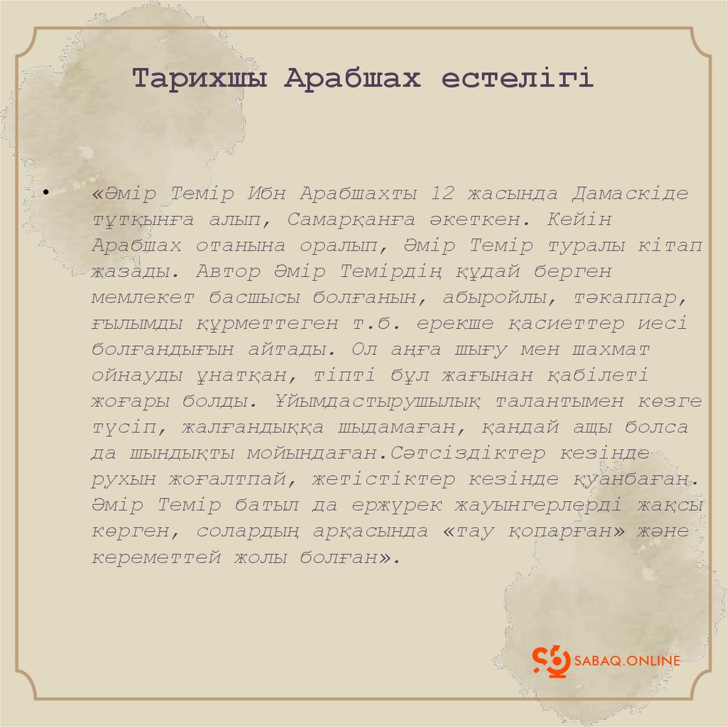 Тарихшы Арабшах естелігі«Әмір Темір Ибн Арабшахты 12 жасында Дамаскіде