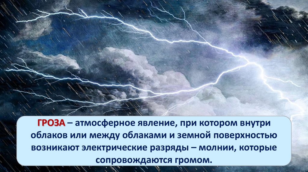 ГРОЗА – атмосферное явление, при котором внутриоблаков или между облаками и земной поверхностью