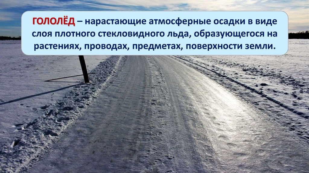 ГОЛОЛЁД – нарастающие атмосферные осадки в видеслоя плотного стекловидного льда, образующегося на