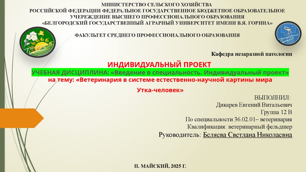 «БЕЛГОРОДСКИЙ ГОСУДАРСТВЕННЫЙ АГРАРНЫЙ УНИВЕРСИТЕТ ИМЕНИ В.Я. ГОРИНА»