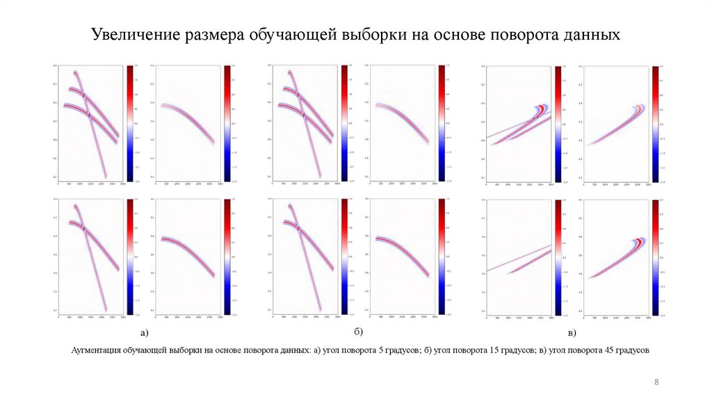 Аугментация обучающей выборки на основе поворота данных: а) угол поворота 5 градусов; б) угол поворота 15 градусов; в) угол поворота 45 градусов