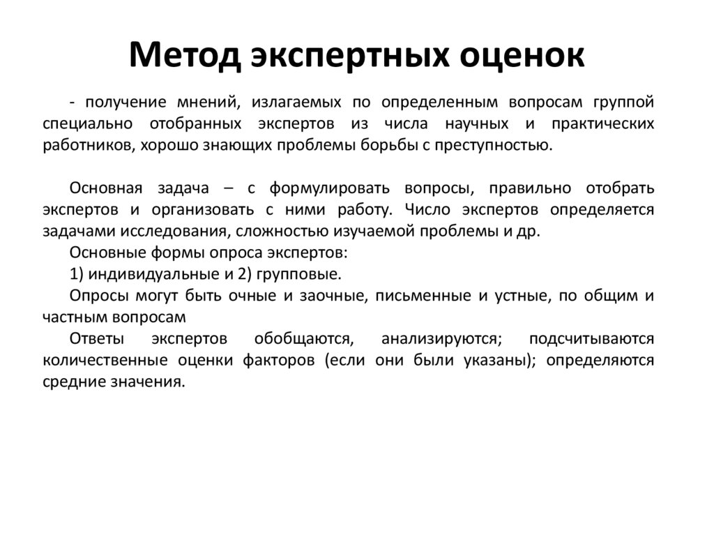 Метод экспертных оценок- получение мнений, излагаемых по определенным вопросам группой