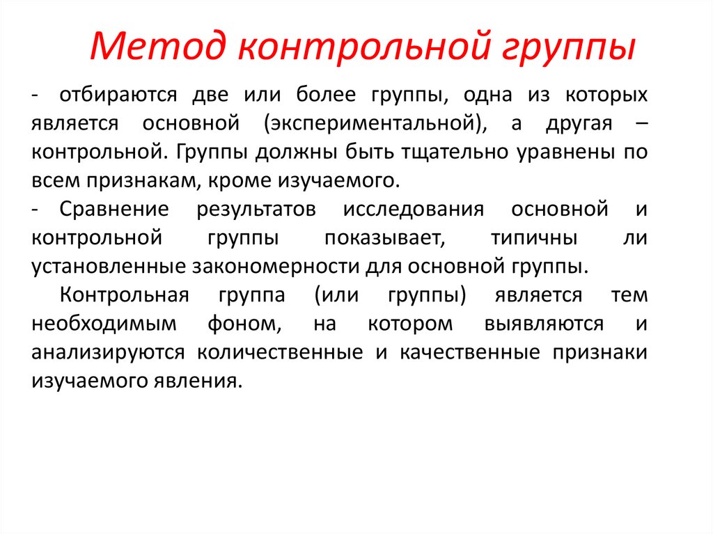 Метод контрольной группы- отбираются две или более группы, одна из которых