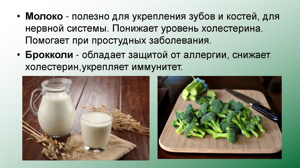 • Молоко - полезно для укрепления зубов и костей, длянервной системы. Понижает уровень холестерина.