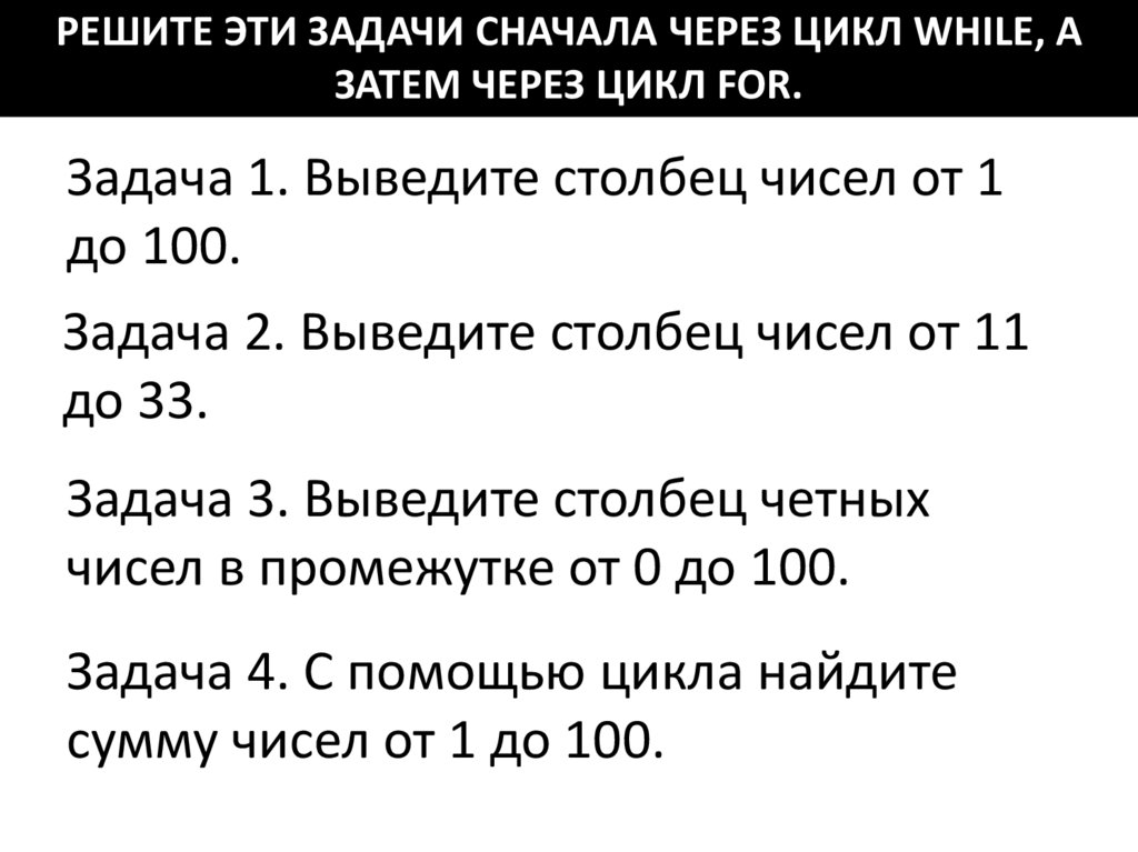 РЕШИТЕ ЭТИ ЗАДАЧИ СНАЧАЛА ЧЕРЕЗ ЦИКЛ WHILE, АЗАТЕМ ЧЕРЕЗ ЦИКЛ FOR.