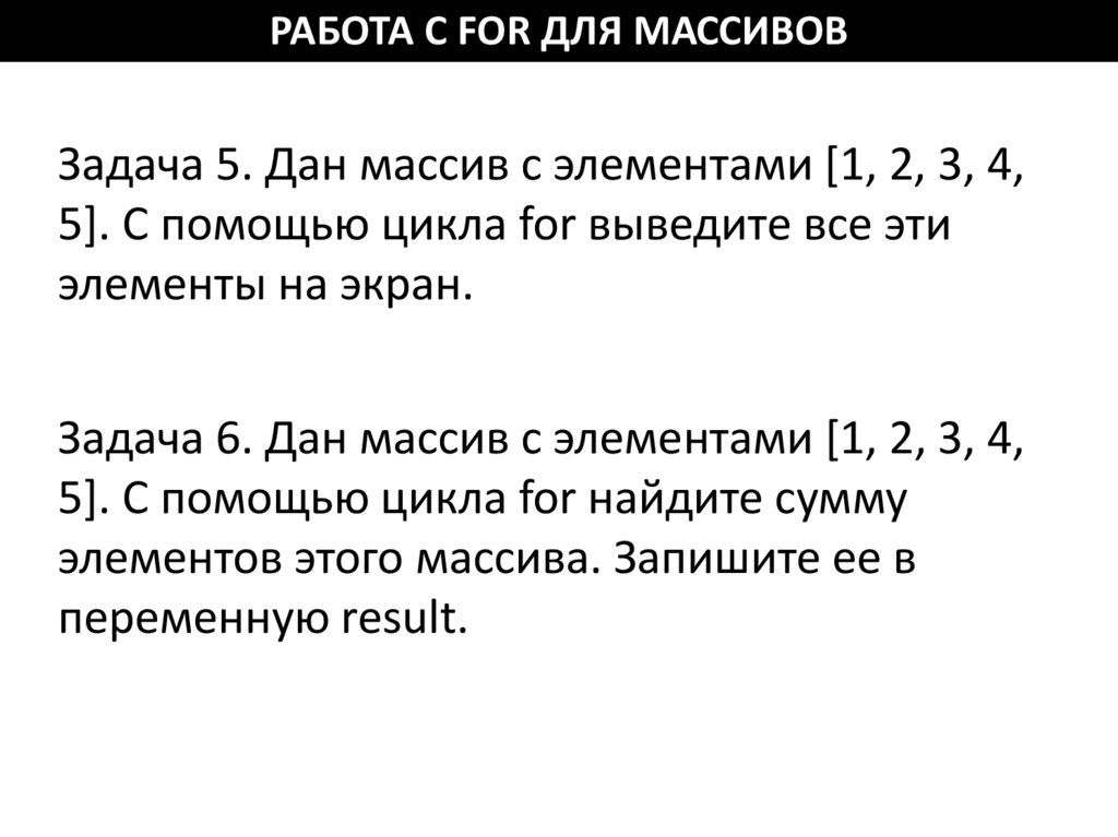 РАБОТА С FOR ДЛЯ МАССИВОВЗадача 5. Дан массив с элементами [1, 2, 3, 4,