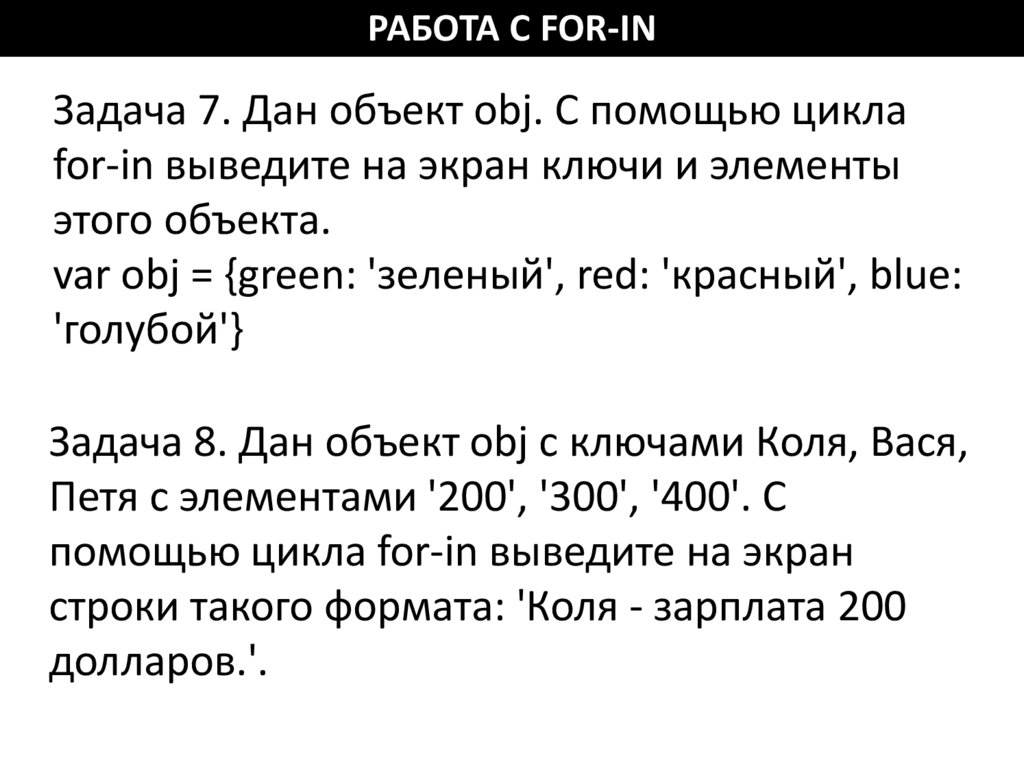 РАБОТА С FOR-INЗадача 7. Дан объект obj. С помощью цикла