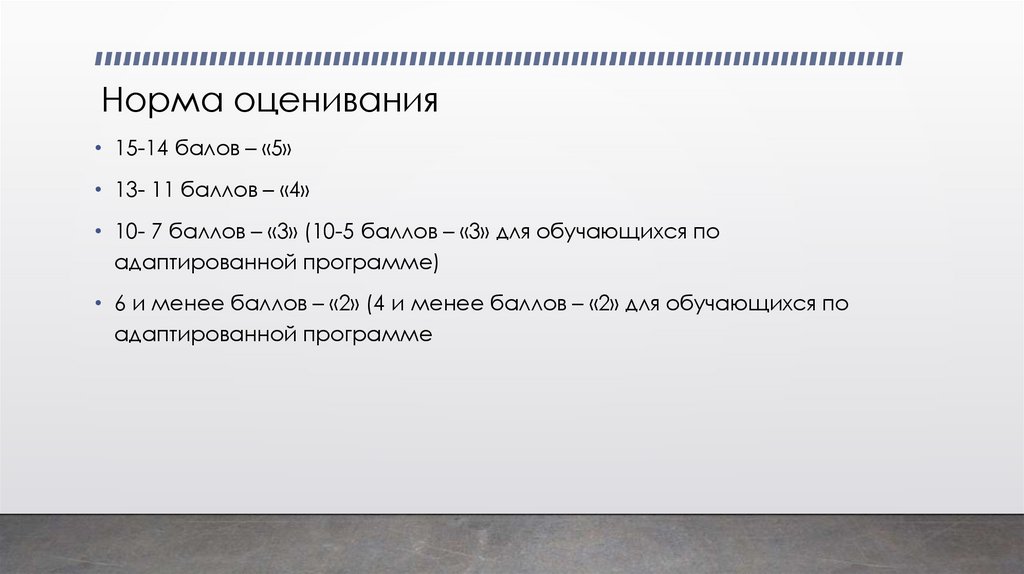 • 10- 7 баллов – «3» (10-5 баллов – «3» для обучающихся по