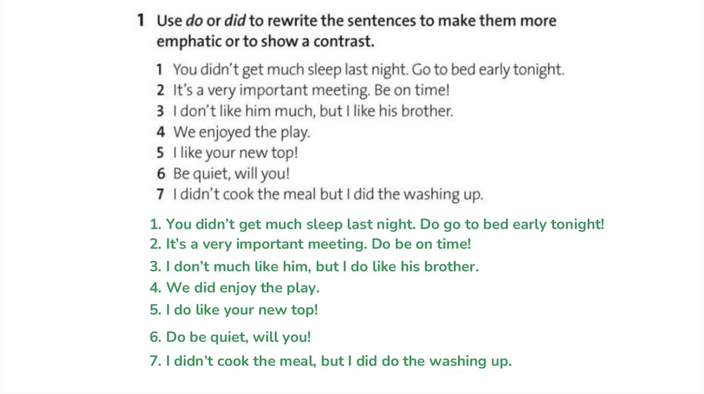 1. You didn’t get much sleep last night. Do go to bed early tonight!2. It’s a very important meeting. Do be on time!