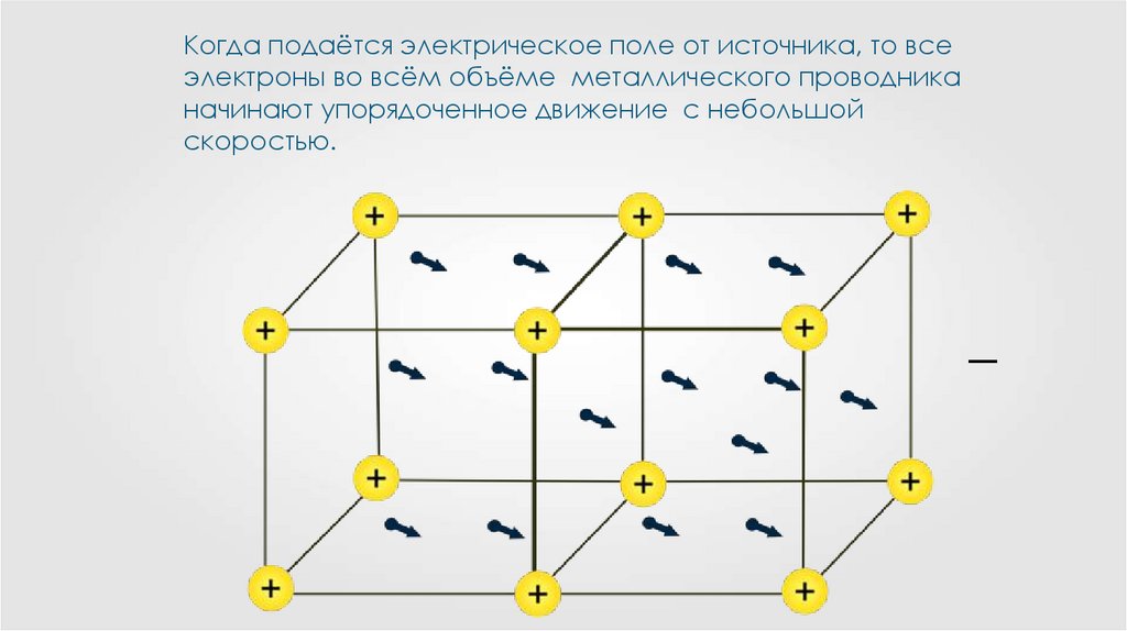 Когда подаётся электрическое поле от источника, то всеэлектроны во всём объёме металлического проводника