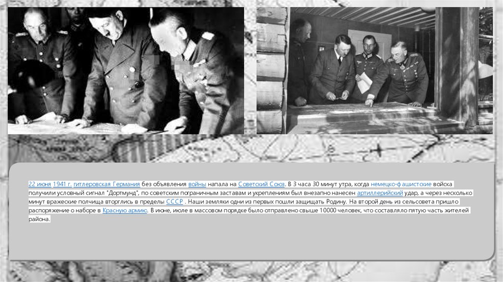 минут вражеские полчища вторглись в пределы СССР . Наши земляки одни из первых пошли защищать Родину. На второй день из сельсовета пришло