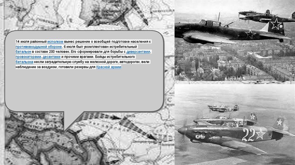 14 июля районный исполком вынес решение о всеобщей подготовке населения кпротивовоздушной обороне. 6 июля был укомплектован истребительный