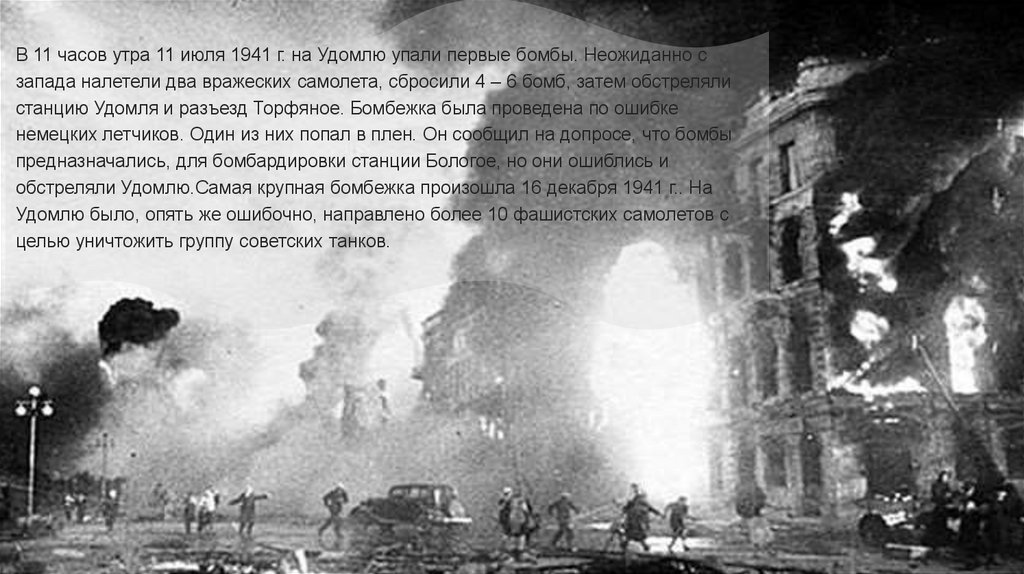 В 11 часов утра 11 июля 1941 г. на Удомлю упали первые бомбы. Неожиданно сзапада налетели два вражеских самолета, сбросили 4 – 6 бомб, затем обстреляли