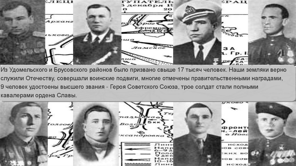 Из Удомельского и Брусовского районов было призвано свыше 17 тысяч человек. Наши земляки вернослужили Отечеству, совершали воинские подвиги, многие отмечены правительственными наградами,