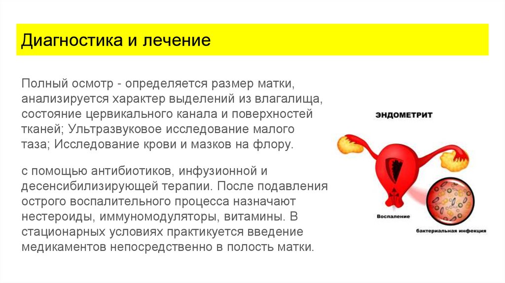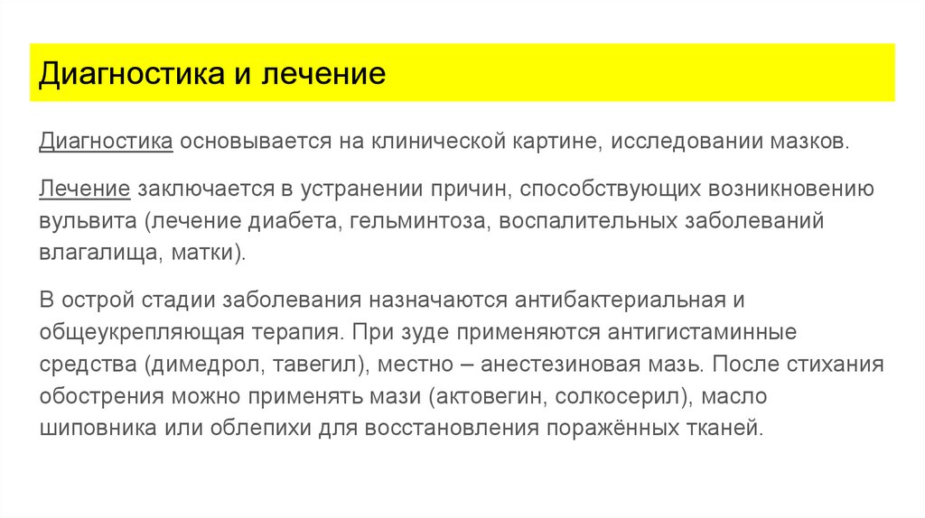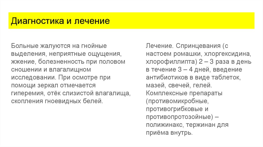 Диагностика и лечениеДиагноз заболевания основывается на жалобах больной данных влагалищного