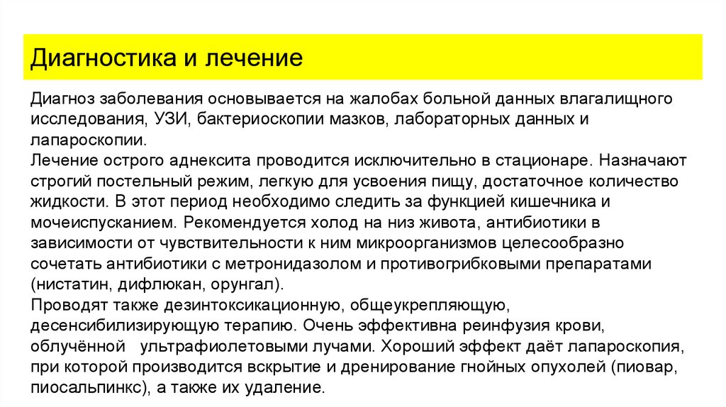 Лечение острого аднексита проводится исключительно в стационаре. Назначают