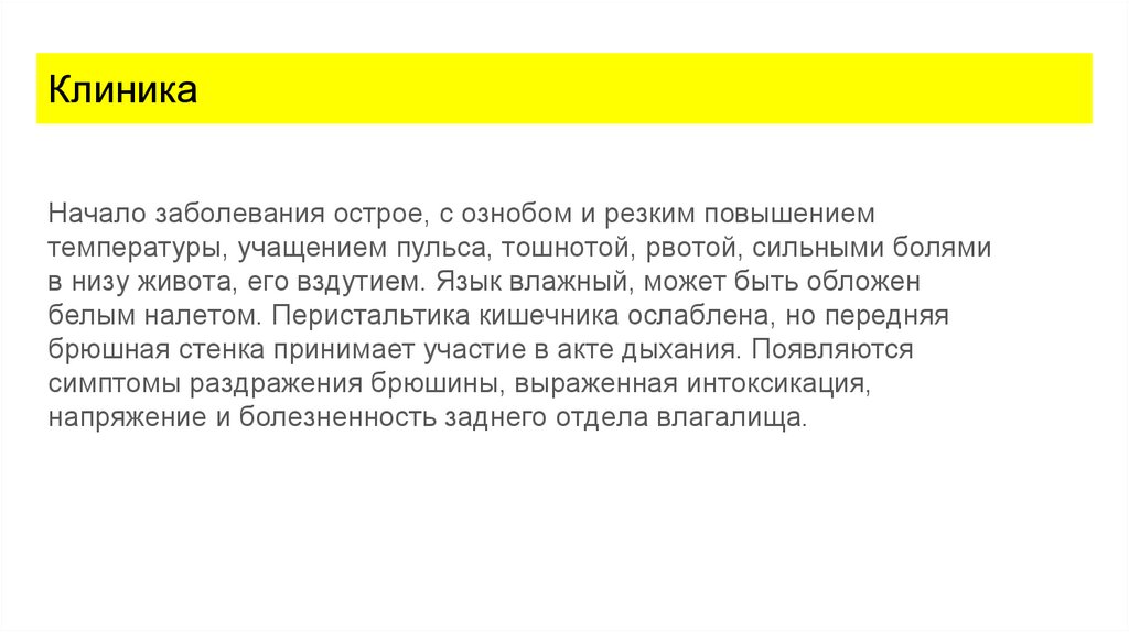 белым налетом. Перистальтика кишечника ослаблена, но передняя