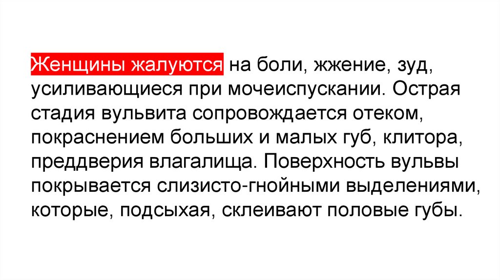 Женщины жалуются на боли, жжение, зуд,усиливающиеся при мочеиспускании. Острая