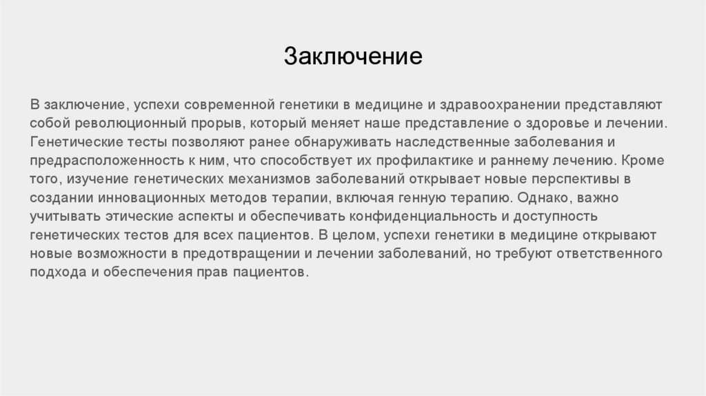 ЗаключениеВ заключение, успехи современной генетики в медицине и здравоохранении представляют