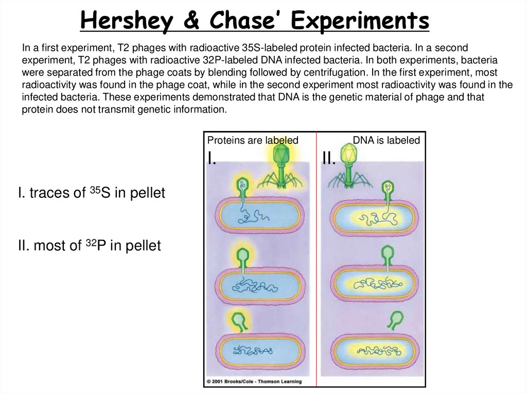 Hershey & Chase’ ExperimentsIn a first experiment, T2 phages with radioactive 35S-labeled protein infected bacteria. In a second