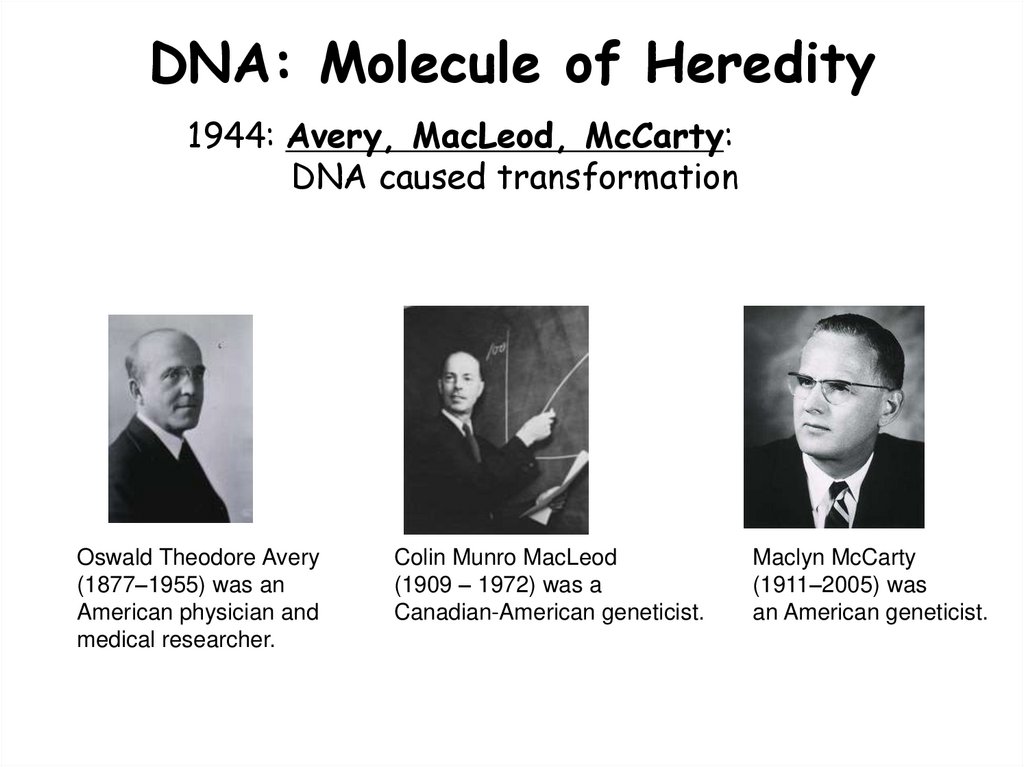 DNA: Molecule of Heredity1944: Avery, MacLeod, McCarty: