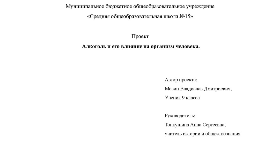 Алкоголь и его влияние на организм человека. Проект