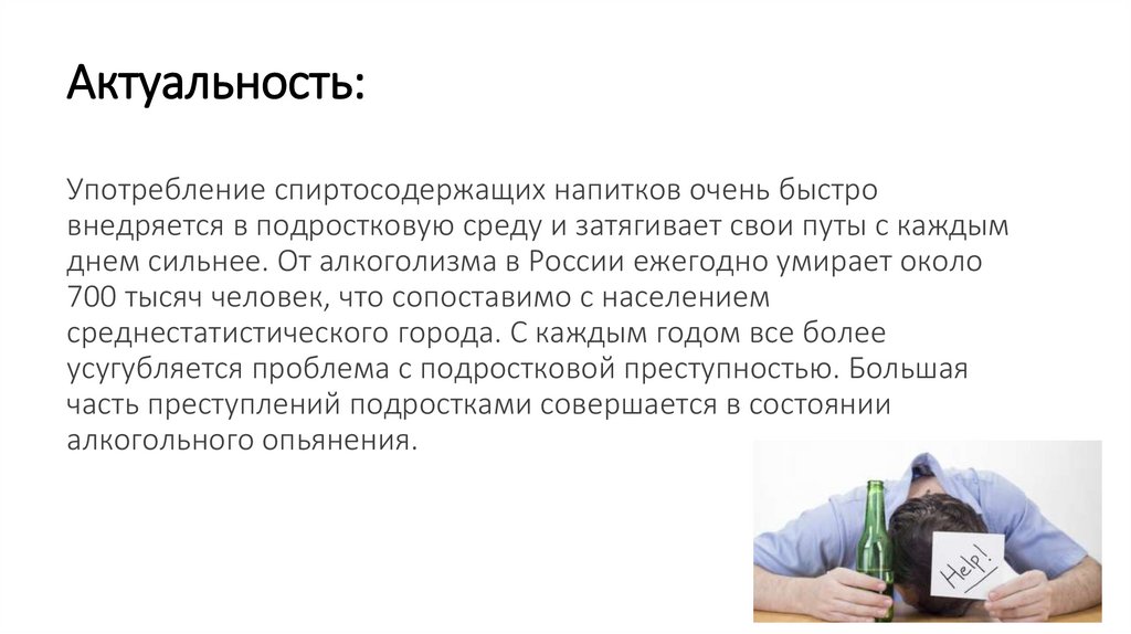 Актуальность:Употребление спиртосодержащих напитков очень быстро
