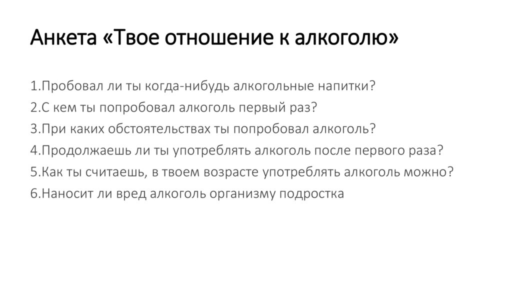 Анкета «Твое отношение к алкоголю»1.Пробовал ли ты когда-нибудь алкогольные напитки?