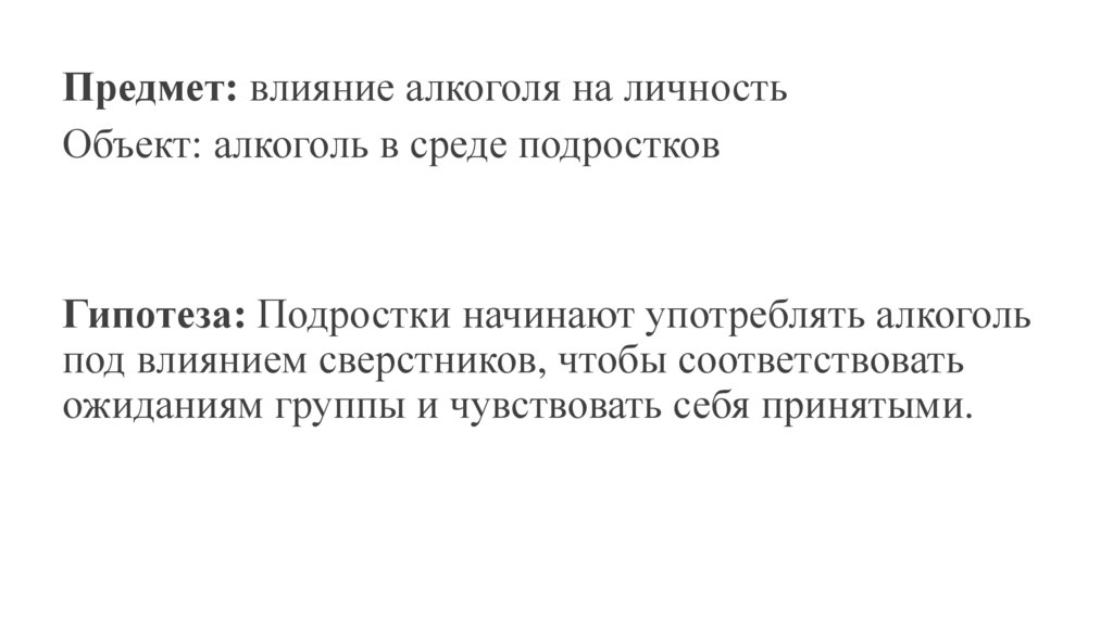 Предмет: влияние алкоголя на личностьОбъект: алкоголь в среде подростков