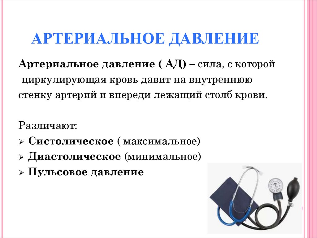 АРТЕРИАЛЬНОЕ ДАВЛЕНИЕАртериальное давление ( АД) – сила, с которой
