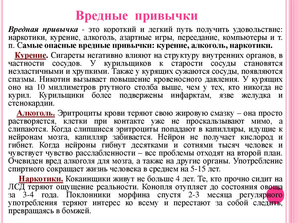 п. Самые опасные вредные привычки: курение, алкоголь, наркотики.