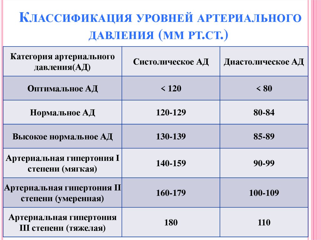 КЛАССИФИКАЦИЯ УРОВНЕЙ АРТЕРИАЛЬНОГОДАВЛЕНИЯ (ММ РТ.СТ.)
