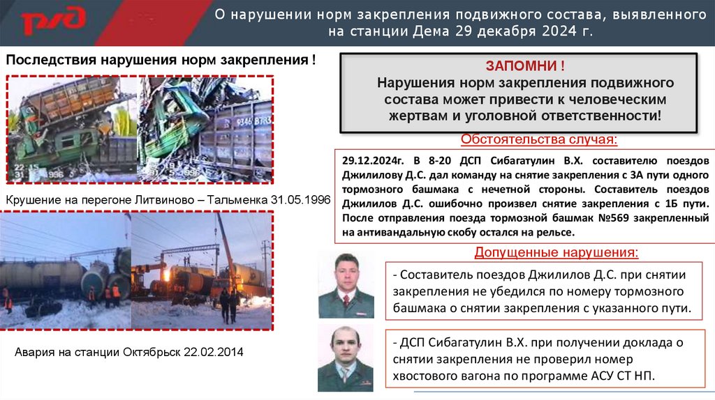 О нарушении норм закрепления подвижного состава, выявленногона станции Дема 29 декабря 2024 г.