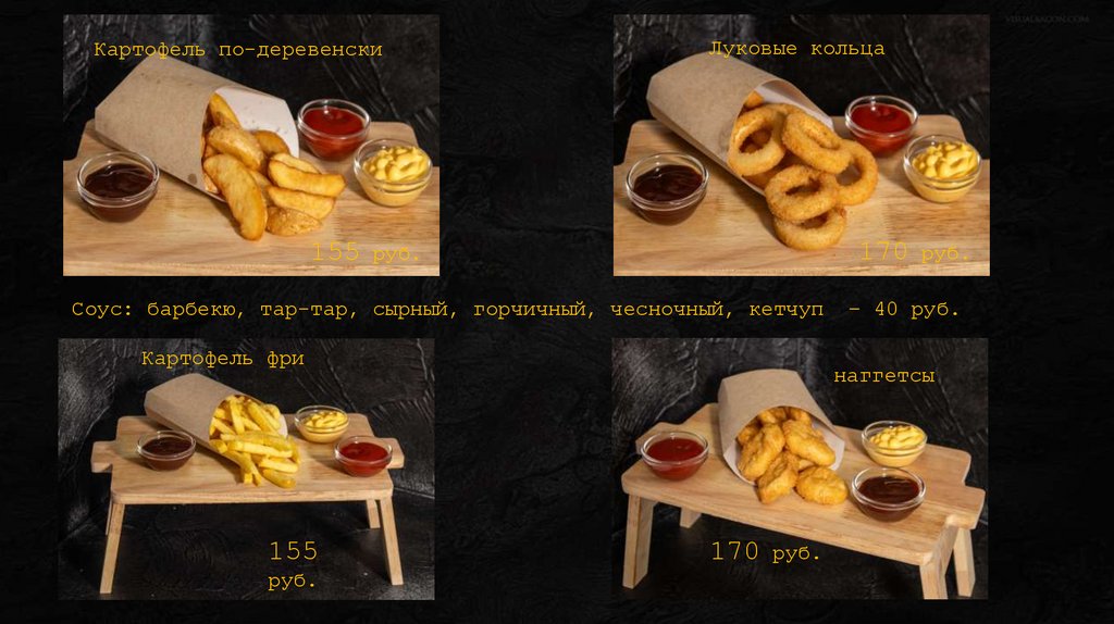 Соус: барбекю, тар-тар, сырный, горчичный, чесночный, кетчуп