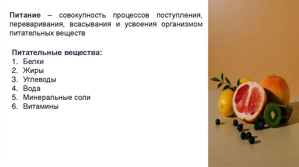 Питание – совокупность процессов поступления,переваривания, всасывания и усвоения организмом