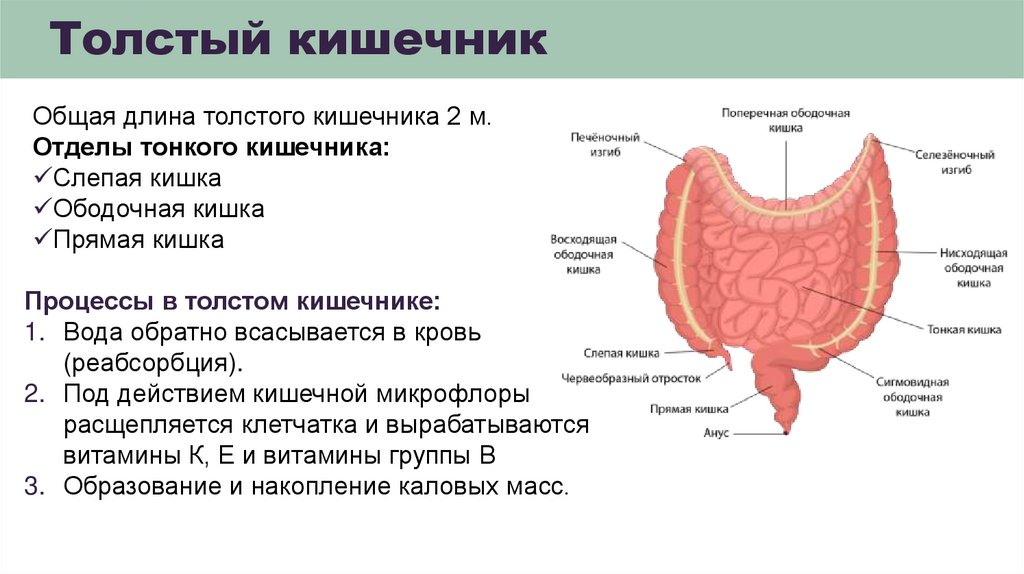 Толстый кишечникОбщая длина толстого кишечника 2 м.