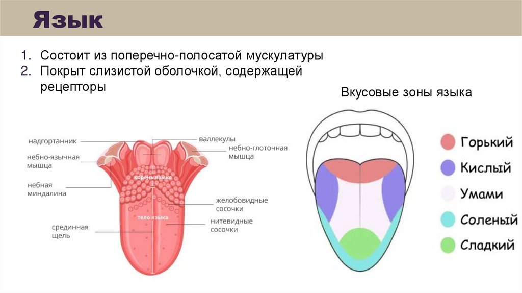 Язык1. Состоит из поперечно-полосатой мускулатуры