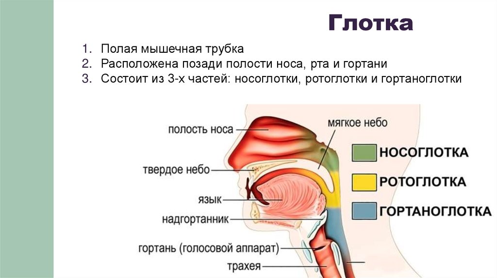 3. Состоит из 3-х частей: носоглотки, ротоглотки и гортаноглотки