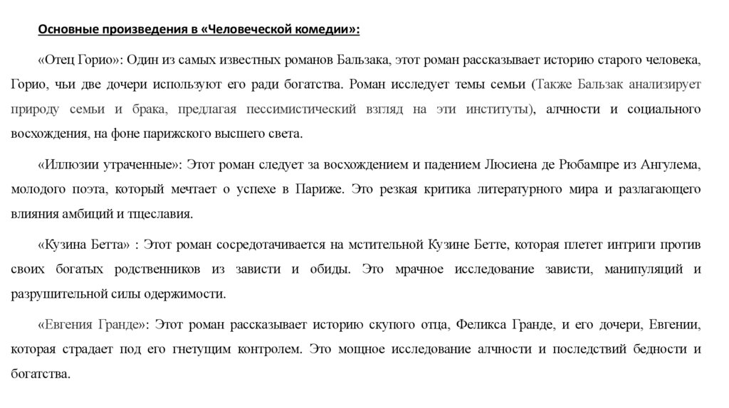 Основные произведения в «Человеческой комедии»:«Отец Горио»: Один из самых известных романов Бальзака, этот роман рассказывает историю старого человека,
