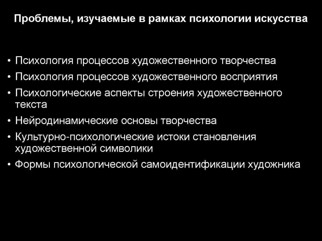 Проблемы, изучаемые в рамках психологии искусства• Психология процессов художественного творчества
