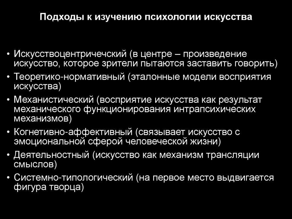 Подходы к изучению психологии искусства• Искусствоцентричечский (в центре – произведение