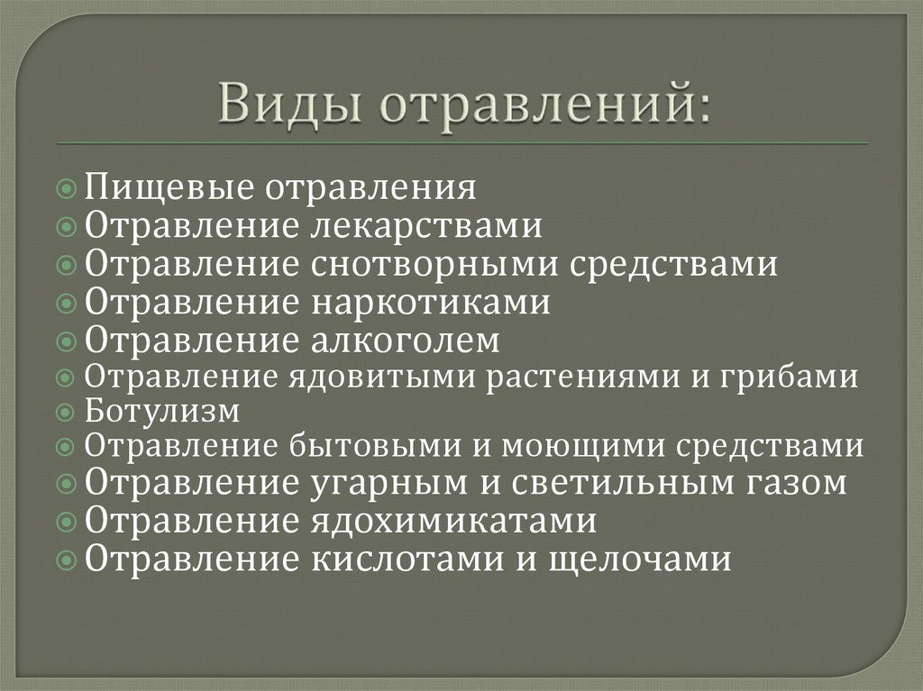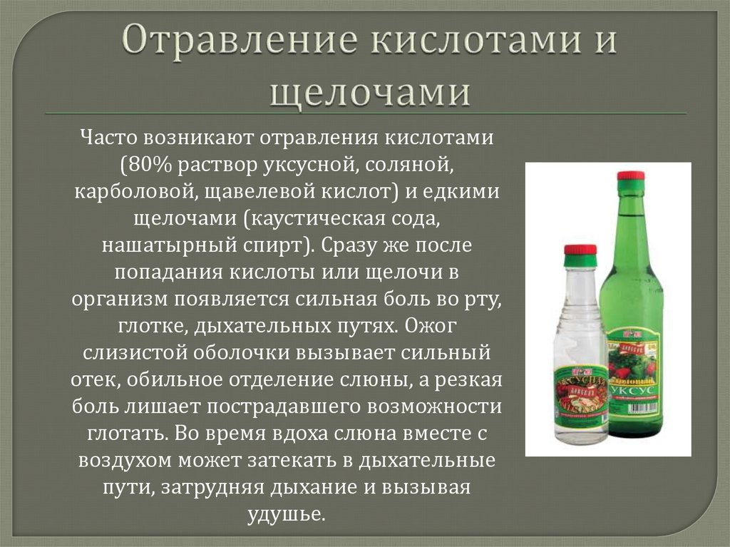 Часто возникают отравления кислотами(80% раствор уксусной, соляной,