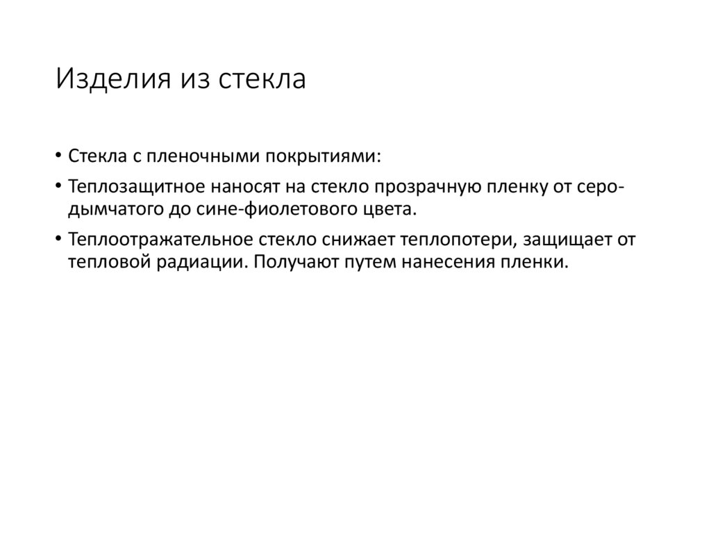 • Стекла с пленочными покрытиями:• Теплозащитное наносят на стекло прозрачную пленку от серодымчатого до сине-фиолетового цвета.