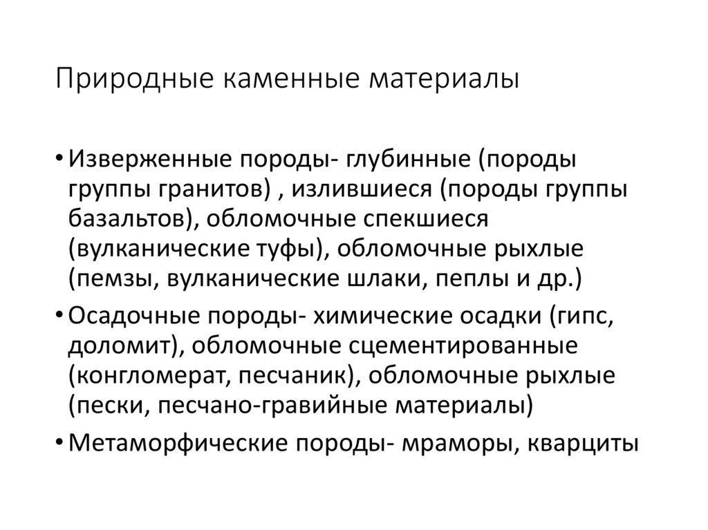 • Изверженные породы- глубинные (породыгруппы гранитов) , излившиеся (породы группы