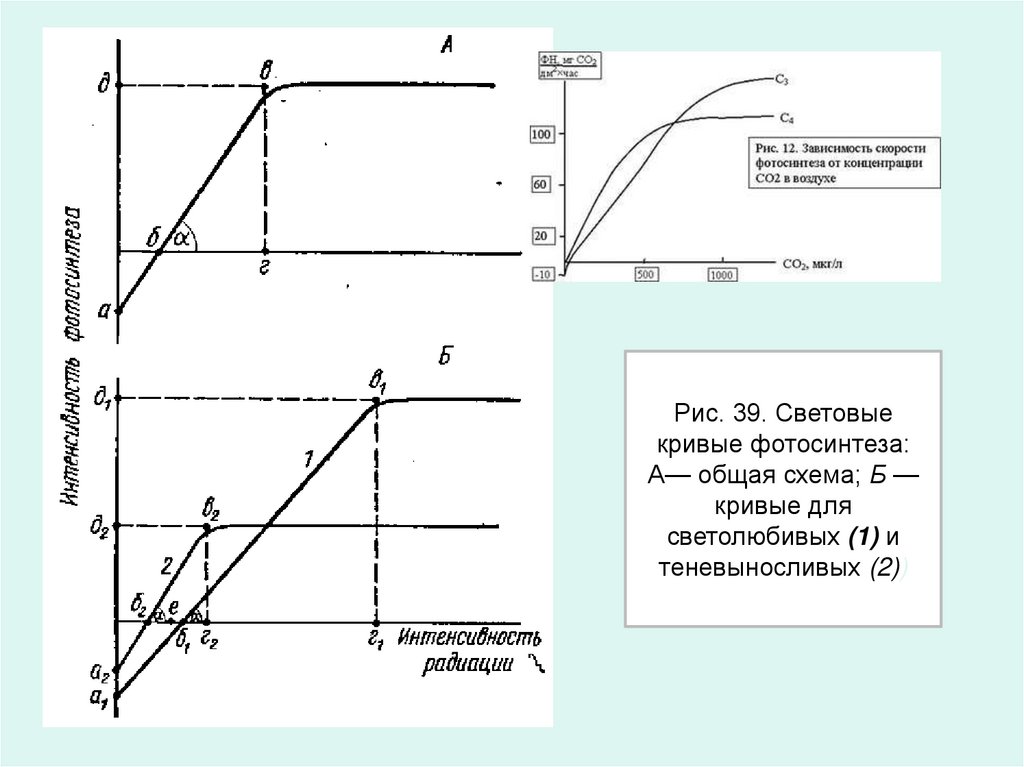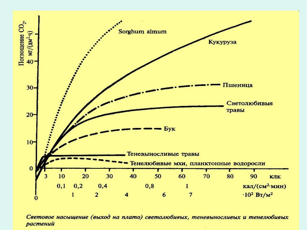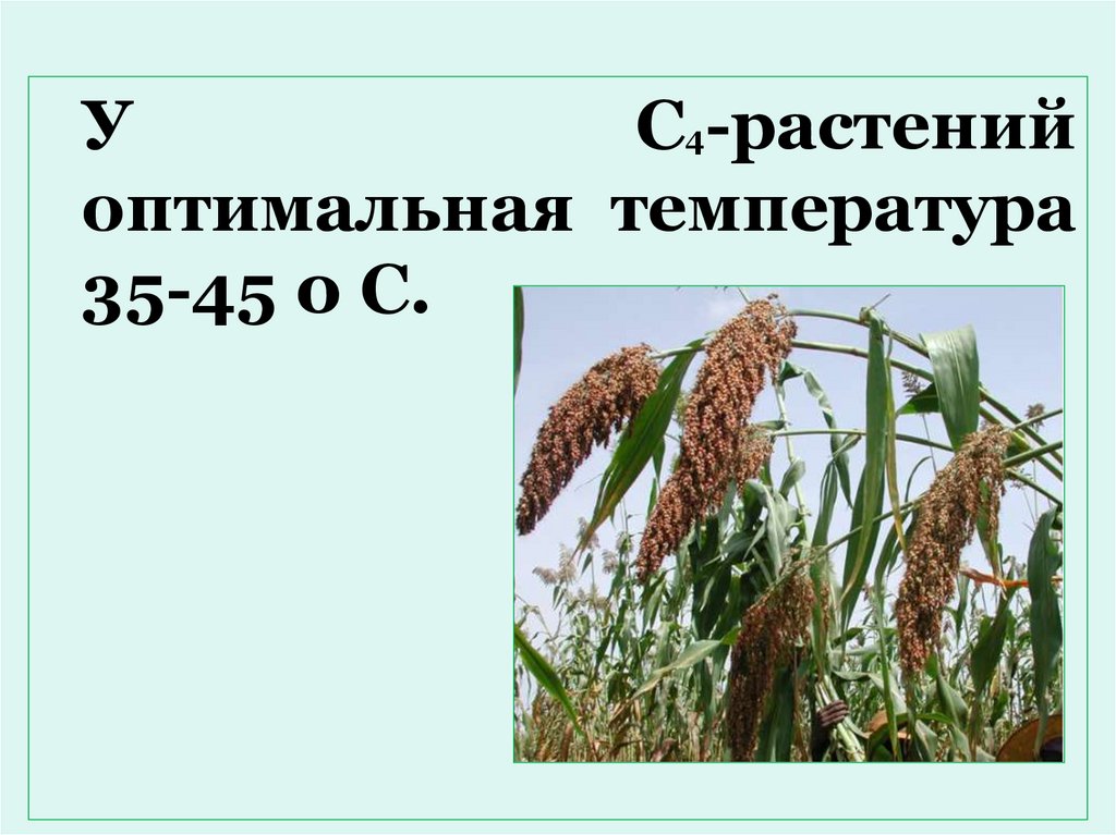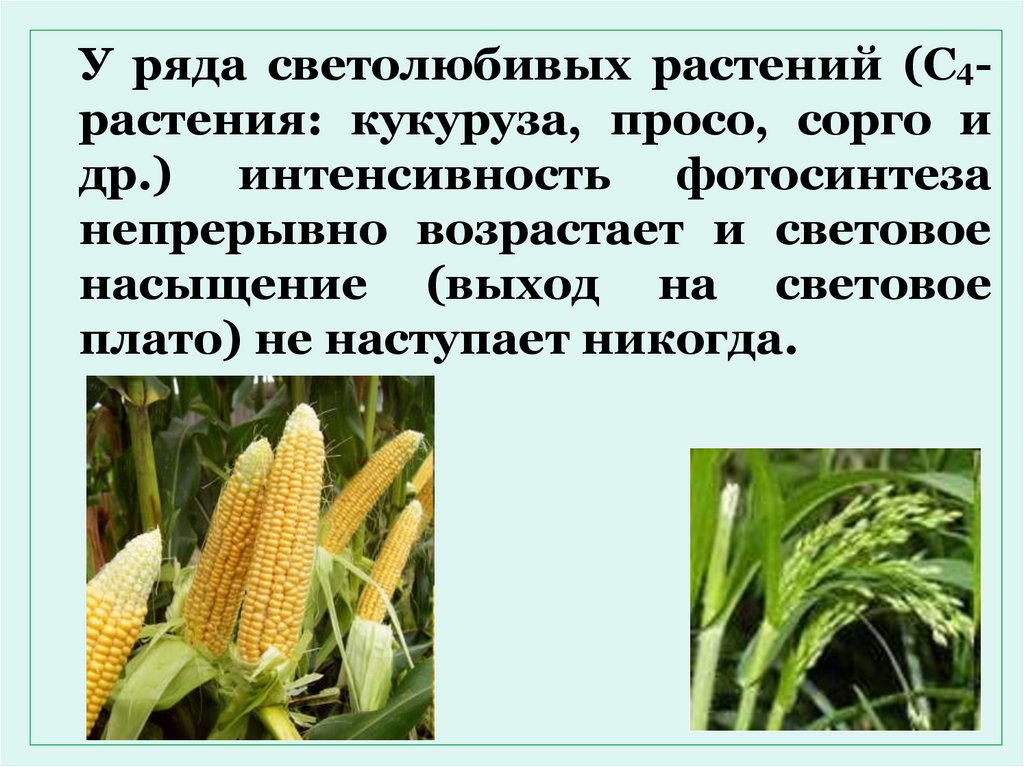 У ряда светолюбивых растений (С4растения: кукуруза, просо, сорго идр.) интенсивность фотосинтеза