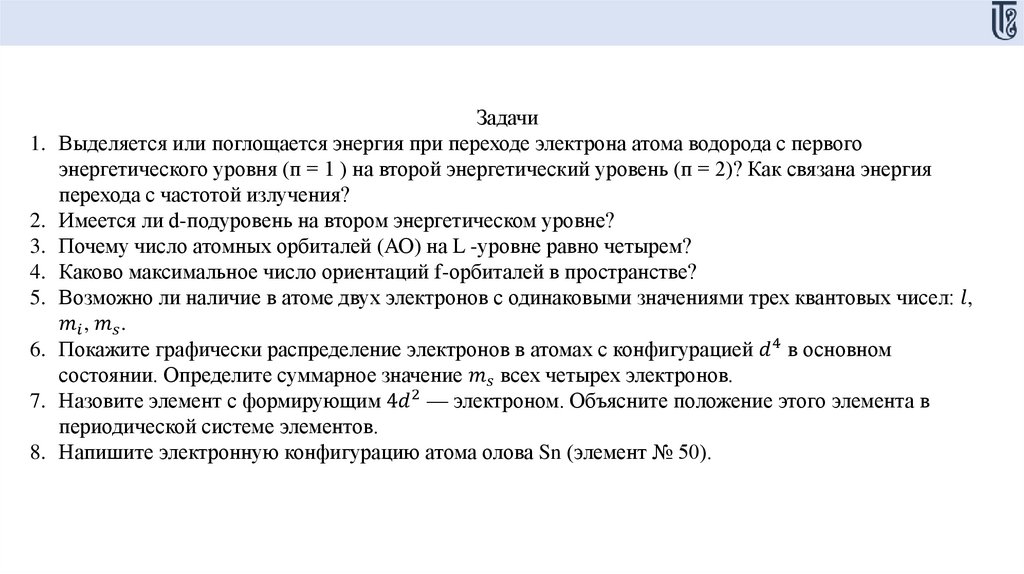 Задачи1. Выделяется или поглощается энергия при переходе электрона атома водорода с первого