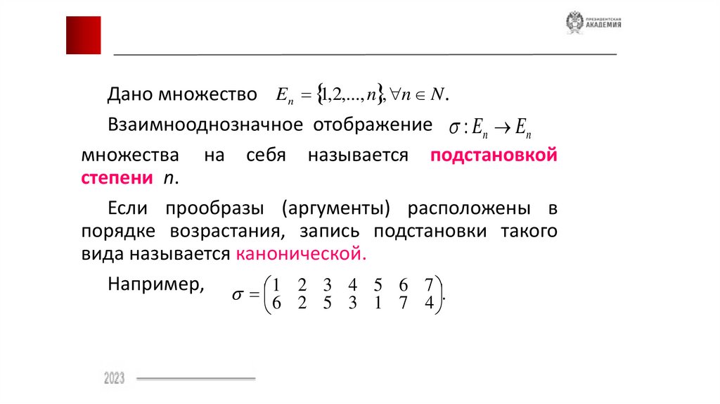 Дано множество En 1,2,..., n , n N .Взаимнооднозначное отображение : En En