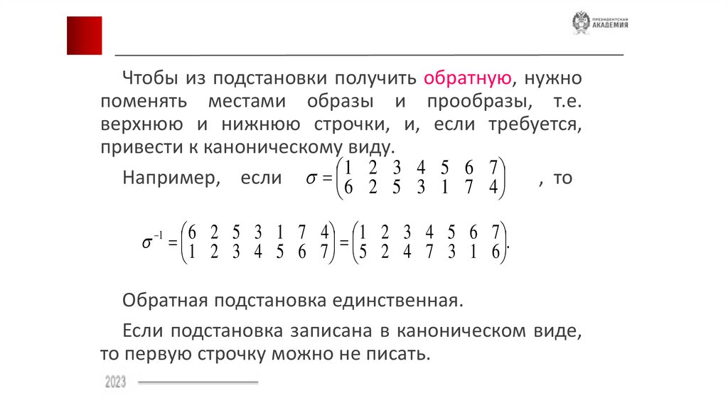 Чтобы из подстановки получить обратную, нужнопоменять местами образы и прообразы, т.е.
